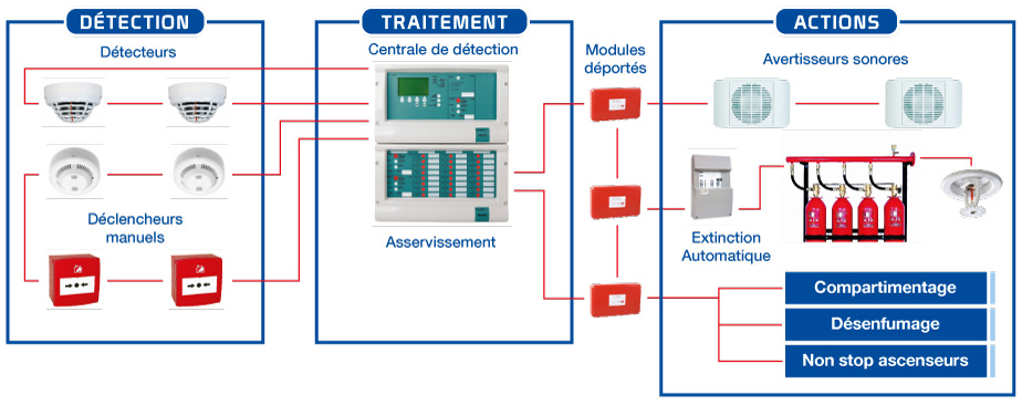 Un système électronique conçu pour détecter les départs de feu et les fuites de gaz toxiques, avertir et gérer la sécurisation des personnes sur place et, éventuellement, commander l’extinction automatique.